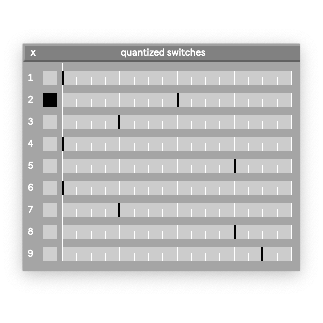 Inspired by Ableton's clip launch quantization, [quantized switches] is a Max for Live MIDI device that toggles 2 values of any mappable parameter at Ableton's global quantization time point, such as turning a track on and off or a parameter of a synthesizer, etc. In addition to triggering the switch at the start time of global quantization, the switch can be triggered at any point in the global quantization cycle.